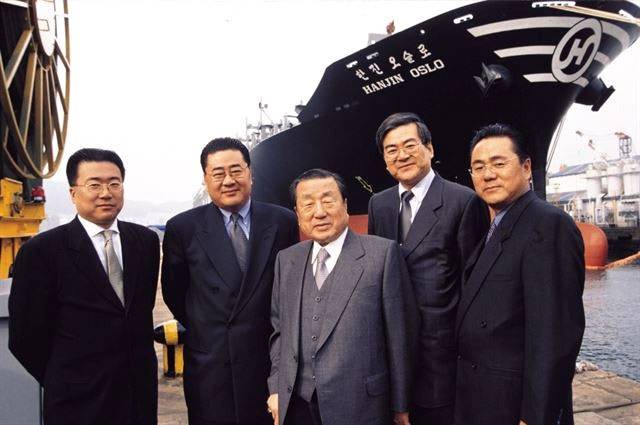 | ▲ 1998년 11월 4일 한진오슬로호 명명식 당시 모습이다. 조중훈 전 한진그룹 회장(가운데)과 4남. (왼쪽부터)조정호 메리츠금융지주 회장, 조수호 전 한진해운 회장, 조양호 전 한진그룹 회장, 조남호 전 한진중공업 회장. |