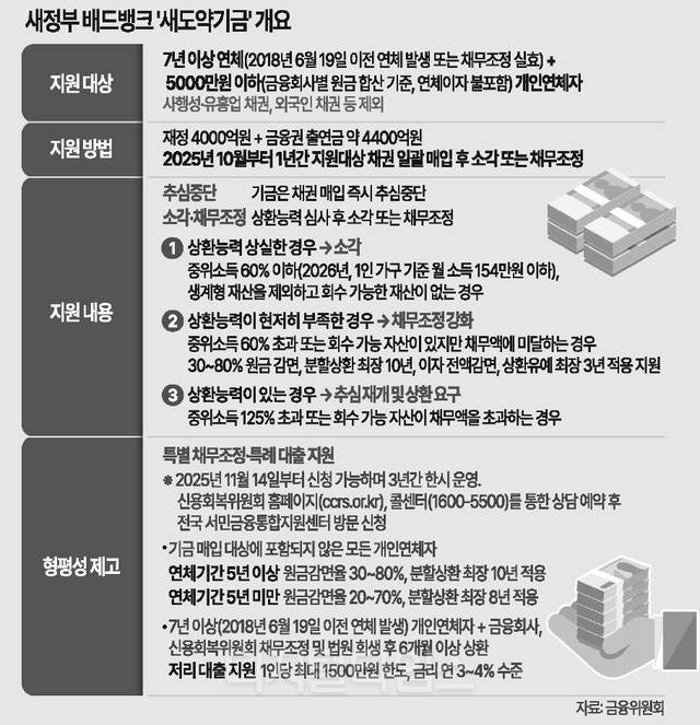이재명 정부의 배드뱅크인 '새도약기금'이 이번 달부터 7년 이상·5000만원 이하의 장기 연체채권을 순차적으로 매입한다.