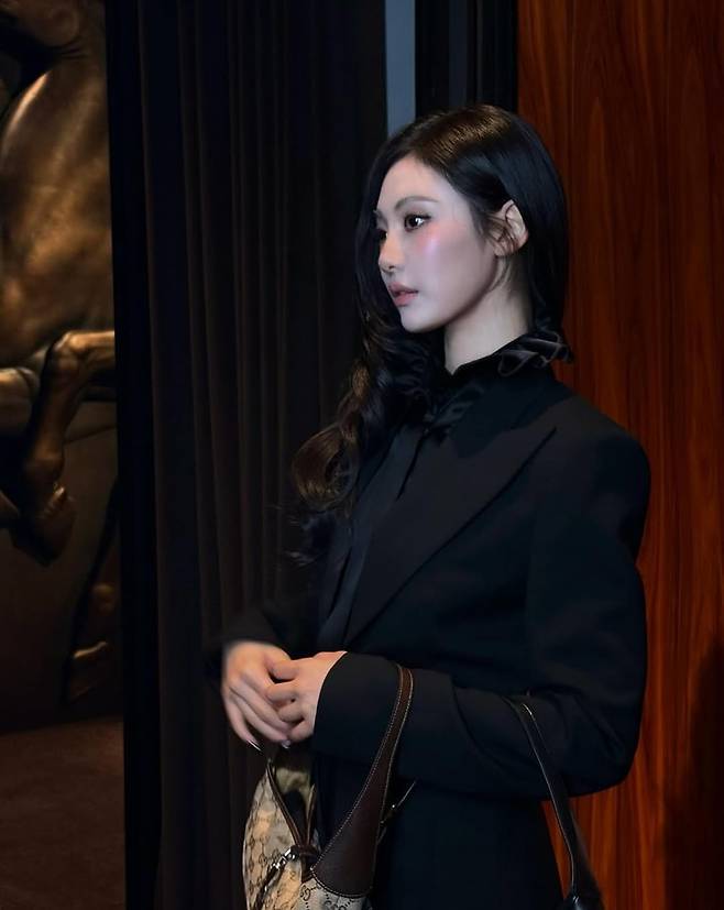 지난 9월 30일 닝닝은 자신의 SNS를 통해 고급스러운 올블랙 슈트 스타일링을 공개했다.