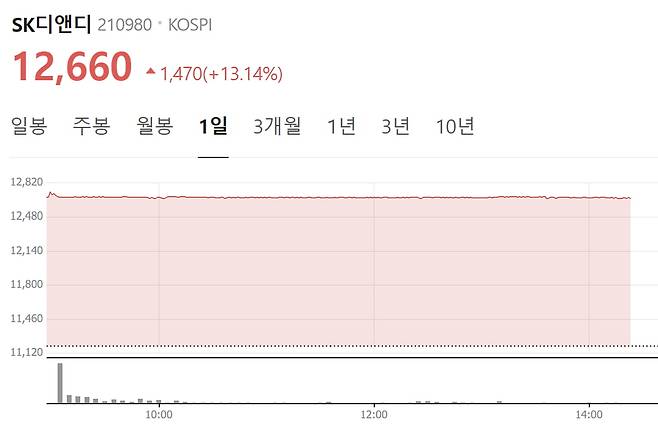 1일 유가증권시장에서 SK디앤디는 오후 2시 기준 13.18%오른 1만2665원에 거래되고 있다. 한앤컴퍼니의 공개매수 가격인 1만2750원에 근접한 수준이다.