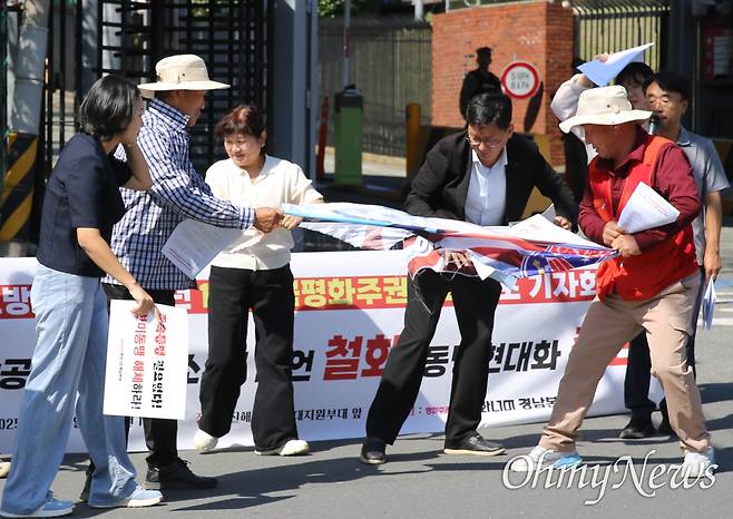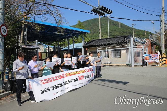 평화주권행동 평화너머경남본부(대표 김정광)가 1일 오전 경남 창원진해 미국함대지원부대 앞에서 "미국의 항공모함, 기지소유 발언 철회. 동맹 현대화 종단"을 내걸고 '한미상호방위조약 72년, 한국평화주권대회'를 열었다.