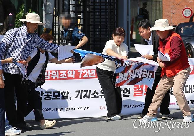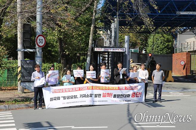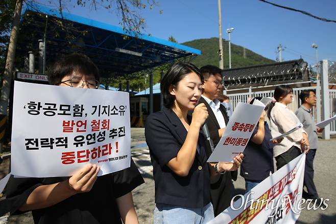 김인애·김지현 회원은 "동맹수탈은 지난 72년 동안 계속돼 왔다. 오늘은 한미상호방위조약이 체결된 지 72년이 되는 날이다"라며 "상호방위조약을 근거로 맺어진 한미동맹은 지난 72년 동안 한국 사회에 군림하며 유형무형의 영향을 행사해 왔다"라고 했다.