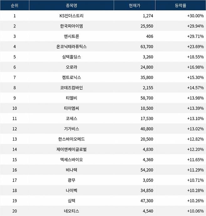 이어 상승률 2위 한국피아이엠(448900)은 주가가 29.94% 폭등하며 종가 25,950원에 상승 마감했다. 상승률 3위 엔시트론(101400)의 주가는 406원으로 29.71% 폭등하며 부진했다. 상승률 4위 온코닉테라퓨틱스(476060)는 23.69% 급등하며 63,700원에 마감했다. 상승률 5위 심텍홀딩스(036710)는 18.55%의 상승세를 타고 종가 3,260원에 마감했다.