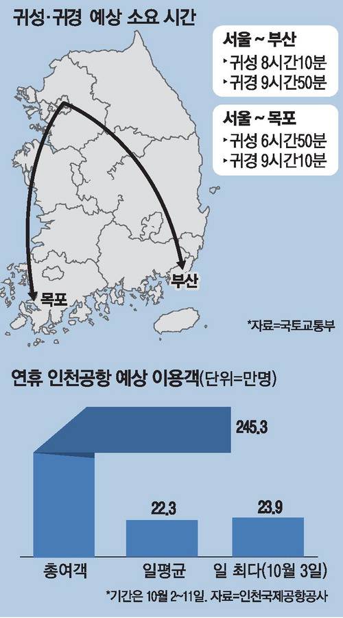 귀성길은 오는 5일이 가장 붐빌 전망이다. 이날 서울에서 부산까지는 8시간10분이 소요될 것으로 관측된다. 지난해(8시간5분)와 비슷한 수준이다. 서울에서 목포까지는 6시간50분 걸릴 것으로 보인다. 지난해(6시간25분)보다 늘어날 것으로 예상된다.