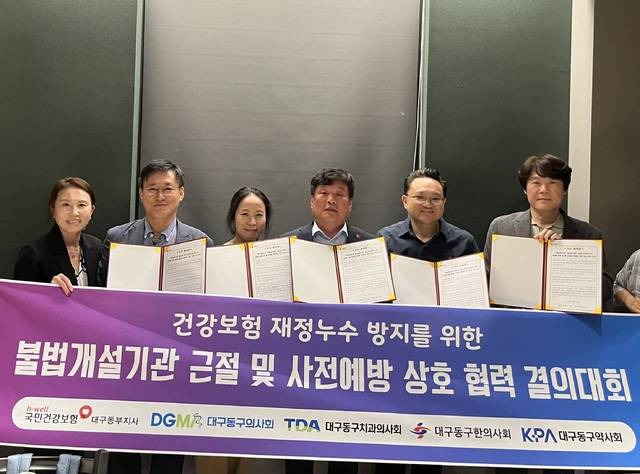 국민건강보험공단 대구동부지사(지사장 김인태)는 지난달 30일 대구 동구지역 4개 의약단체(의사회, 치과의사회, 한의사회, 약사회)와 건강보험 재정누수를 차단하고자 '불법개설 의료기관 근절 및 사전예방 결의대회'를 가졌다.