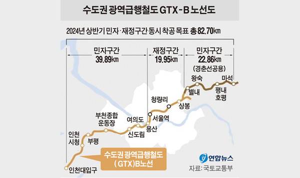 GTX-B는 인천 송도국제도시 인천대입구역에서 서울역을 거쳐 남양주 마석역까지 82.8㎞를 잇고 수도권 서남부와 동북권을 고속으로 관통하는 노선으로 재정구간과 민자구간으로 추진된다.