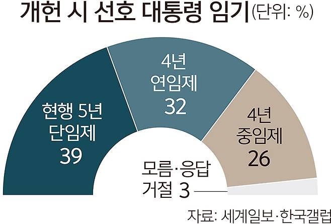 세계일보가 한국갤럽에 의뢰, 지난달 29일부터 30일까지 전국 성인 1010명을 대상으로 휴대전화 면접방식으로 실시한 여론조사(95% 신뢰수준, 오차범위 ±3.1%포인트) 결과, 응답자의 39%는 대통령 임기로 현행 5년 단임제를 지지하는 것으로 조사됐다.