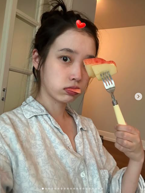 사진 속 아이유는 잠옷 차림에 민낯으로 사과를 먹고 있는 모습을 담았다. 잡티 하나 없는 무결점 피부는 물론, 눈부신 비주얼을 자랑해 눈길을 사로잡았다.