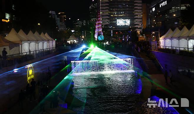 [서울=뉴시스] 박주성 기자 = 1일 오후 서울 청계광장에서 열린 청계천 복원 20주년 행사에서 레이저 아트가 청계천에 펼쳐지고 있다. 2025.10.01. park7691@newsis.com