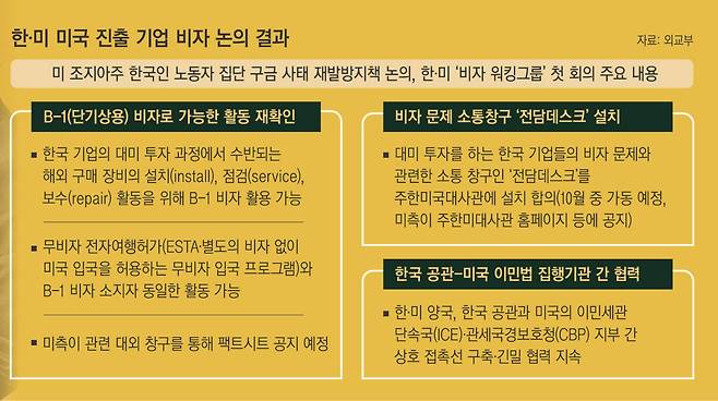 한·미 양국이 지난달 30일(현지시간) 대미 투자 기업들의 경우 단기상용(B-1) 비자와 전자여행허가(ESTA)로도 해외 구매 장비의 설치·점검·보수가 가능하다는 점을 재확인하면서 양국 비자 문제에 대한 단기적인 돌파구를 마련했다는 평가가 나온다. 9월4일 미 조지아주에서 이민당국의 대규모 한국인 체포·구금 사태가 발생한 지 26일 만이다. 다만 한국 기업을 위한 별도의 비자 카테고리 신설 등 근본적인 제도 개선은 과제로 남았다.