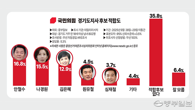 1일 중부일보 의뢰로 여론조사기관 데일리리서치가 경기도 거주 만 18세 이상 남녀 802명을 대상으로 지난달 28일부터 29일까지 이틀간 실시한 여론조사 결과(95% 신뢰수준에 오차범위 ±3.5%p)에 따르면, '국민의힘 경기도지사 후보로 누가 가장 적합하다고 생각하느냐'라는 물음에 응답자 16.8%가 안철수 의원을 지목했다. 나경원 의원을 택한 응답자가 15.5%에 달해 두 지지율 격차는 불과 오차범위 안인 1.3%p다.