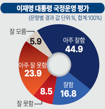 1일 중부일보 의뢰로 여론조사기관 데일리리서치가 경기도 거주 만 18세 이상 남녀 802명을 대상으로 지난달 28일부터 29일까지 이틀간 실시한 여론조사 결과(95% 신뢰수준에 오차범위 ±3.5%p)에 따르면, '이재명 대통령의 국정운영에 대해 어떻게 평가하느냐'라는 질문에 응답자 61.7%가 긍정평가를 내렸다. 아주 잘하고 있다는 44.9%, 잘하고 있는 편은 16.8%다.