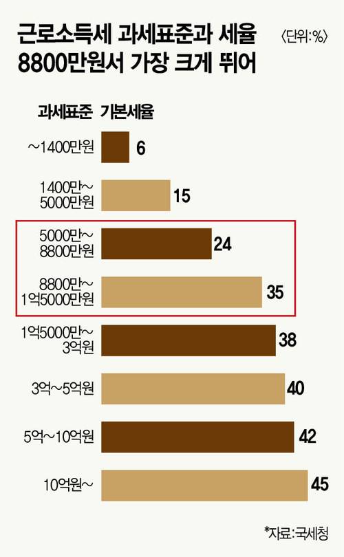 고소득 흙수저의 최대 불만 중 하나는 소득세다. 돈을 많이 벌수록 많이 내는 누진세 구조다. 현행 소득세법에 따른 과세표준(세금 부과시 기준 금액)은 8단계다. 연소득 8800만~1억5000만원 구간은 8800만원 초과 금액에 소득세율 35%를 적용한다. 직전 과세표준 구간보다 11%포인트 높다. 8단계 과세표준 중 가장 크게 소득세율이 뛴다. 통상 고소득자로 분류되는 대다수가 포함되는 구간이다. 고소득자 사이에서 연소득 8800만원이 ‘경계선’으로 불리는 이유다.