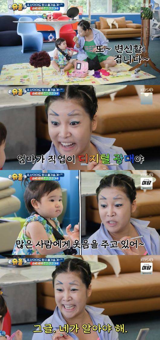 자신을 빤히 바라보는 딸에 랄랄은 "서빈아 엄마가 직업이 디지털 광대야. 그래서 웃음을 팔고 다녀"라고 말했다.
