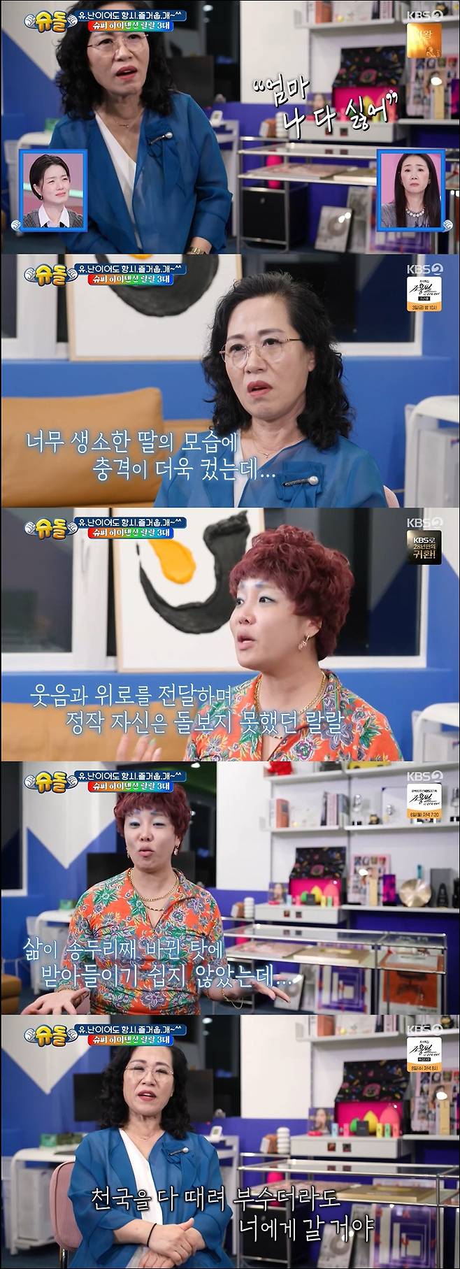 어머니가 랄랄을 걱정하는 이유가 있었다. 어머니는 "어느날 전화가 왔더라. 목소리가 어둡다. '엄마' 하는데 벌써 알겠더라. '무슨 일 있냐' 하니까 다짜고짜 '나 다 싫어' 이러는 거다. 서빈이도 싫고 다 싫다더라. 망치로 머리를 얻어 맞은 기분이었다"고 떠올렸다.