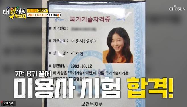 이지현은 "7번 떨어졌다"고 했고, 탁재훈은 "너무 소질 없는 거 아니냐"라고 짚었다. 그러자 이지현은 "나도 그런 줄 알았는데, 하니까 되더라. 준비 기간은 최소 6개월인데, 전 1년 3개월 걸렸다"라고 밝혔다. 7전 8기 끝에 미용사 시험에 합격했다고. 이지현은 합격 소감에 관해 "포기하지 않고 오길 잘했다"라고 전했다. 정식 디자이너 전 준 디자이너로 데뷔한 이지현의 첫 손님은 축구선수 출신 김영광이었다.