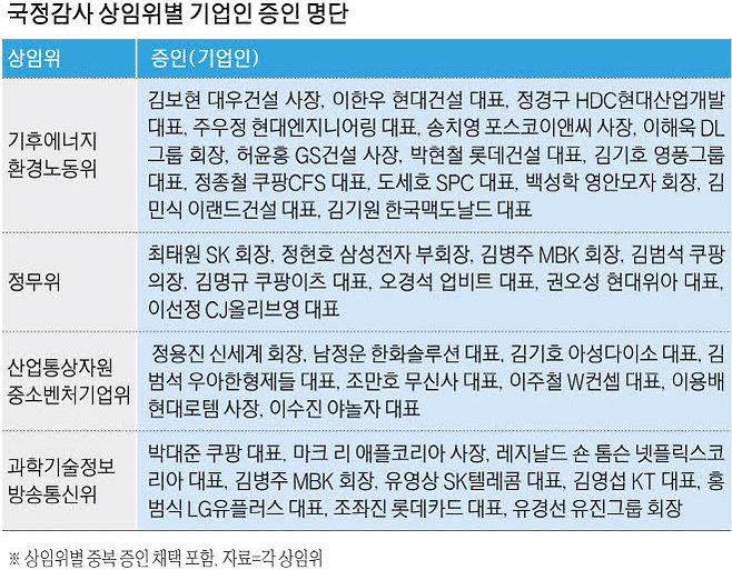 그럼에도 증인 채택이 의결된 각 상임위의 증인 명단을 보면 기업인이 대다수를 차지한다. 과학기술정보방송통신위원회의 경우 92명의 증인 중 절반가량이 기업인이다. 박대준 쿠팡 대표, 마크 리 애플코리아 사장, 레지날드 숀 톰슨 넷플릭스서비스코리아 대표 등은 납치 광고, 인앱결제, 소비자 기만 등을 이유로 과방위 증인으로 채택됐다.