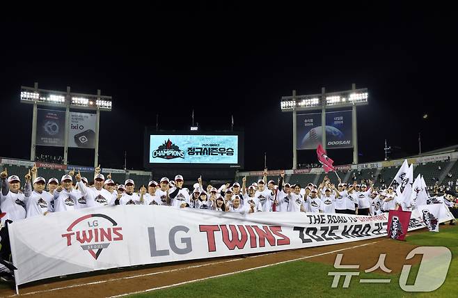(서울=뉴스1) 황기선 기자 = 2년 만에 프로야구 정규시즌 우승을 확정한 LG 트윈스 선수들이 1일 서울 송파구 잠실야구장에서 우승 세리머니를 하고 있다. 한국시리즈에 직행한 LG는 구단 사상 4번째 통합우승에 도전한다. 2025.10.1/뉴스1