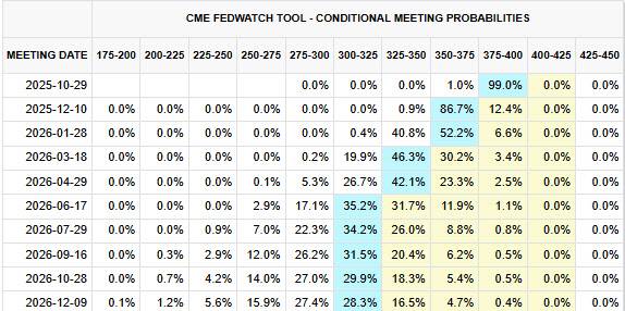 시장조사업체 시카고상품거래소(CME) 그룹의 ‘페드워치’에 따르면 장 마감시점 시장은 10월 연방공개시장위원회(FOMC) 회의에서 금리 인하가 단행될 가능성을 99%로, 12월 회의에서 추가 인하 가능성을 86.7%로 반영하고 있다. 이는 셧다운이 시작된 직후보다 높은 수치다. 10월엔 ‘빅컷’ 가능성도 1%를 반영했다.
