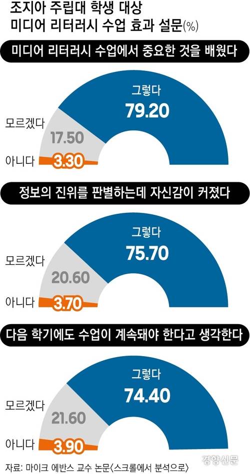 ‘사람은 바뀌지 않는다’는 자조는 현 상황을 회복 불가능한 것처럼 보이게 하지만 미디어 리터러시 인프라 구축에 따른 발전 가능성도 존재한다. 마이크 에번스 미국 조지아주립대 교수와 연구진은 ‘스크롤에서 분석으로: 대학 입문 과정에 온라인 정보 출처 확인 통합하기’라는 논문에서 대학 1학년 학생들을 대상으로 미디어 리터러시 수업을 한 결과 정보 출처 확인 능력이 18% 향상됐다고 밝혔다. 해당 수업에 참가한 학생들 중 80%가 ‘중요한 내용을 배웠다’고 답했다. ‘정보 진위 판별에 자신감이 생겼다’는 대답도 76%나 됐다. 수업 시간은 한 학기 동안 겨우 150분이면 충분했다.