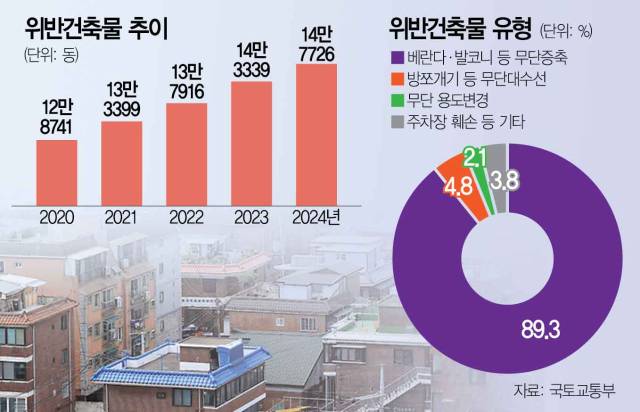 국토교통부는 1일 위반 건축물을 일시 해소하고 신규 불법 행위를 원천 차단하는 내용의 '위반 건축물 합리적 관리 방안'을 이같이 발표했다. 위반 건축물에 대한 한시적 양성화는 과거 5차례 진행된 바 있다. 이번 대책은 2014년 이후 11년 만이다. 전국의 위반 건축물은 지난해 말 기준으로 약 14만 8000동으로 2015년 8만 9000동에서 매년 5000∼6000동씩 계속 증가해왔다. 특히 주거용 위반건축물 8만 3000동 중 소규모 단독·다가구·다세대주택이 4만 6000 동으로 절반(54.7%)을 넘어 비아파트에 거주하는 서민의 주거환경 문제가 불거졌다.