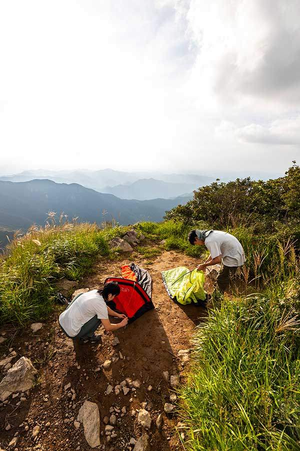 텐트 대신 챙겨온 비비색을 설치하고 한 숨 돌리려 자리를 잡고 앉는다. 방금까지 파랗던 하늘에 어두운 구름이 깔렸다. 회색 구름은 점점 커지더니 순식간에 그림자를 만들어 낸다. 푸르게 보이던 산들이 희미하게 색을 잃는다. 산, 뒤의 산, 또 그 뒤 산들이 회색빛으로 깔린다. 첩첩산중의 풍경에 구름 사이 새어나오는 햇살 몇 가닥이 얹힌다. 아름다운 풍경에 넋을 잃은 것도 잠시 똑, 똑 빗방울이 떨어지기 시작한다.