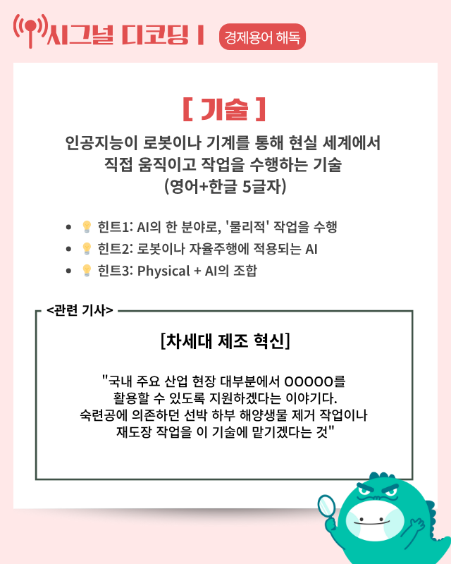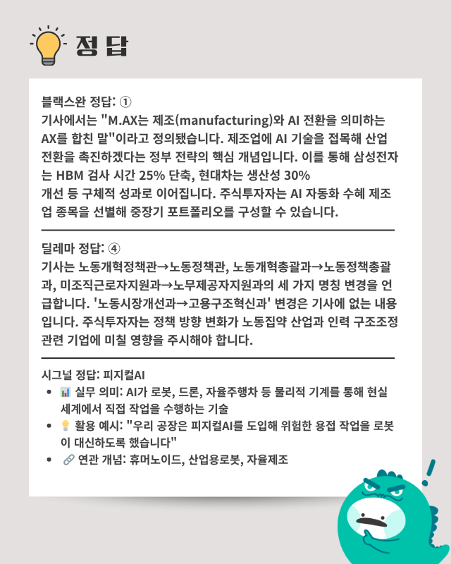 ■ AI 팩토리 확산과 제조업 혁신 가속: 정부가 현재 102개인 AI 팩토리를 2030년까지 500곳으로 확대하며 삼성전자는 HBM 품질 검사 정확도를 99% 이상 높이고 현대차는 생산성을 30% 끌어올리는 성과를 냈다. 신입 직장인들은 피지컬 AI와 휴머노이드 로봇 도입으로 단순 반복 업무가 자동화되는 환경에서 AI 협업 능력과 고부가가치 업무 역량 개발이 필수적이다.