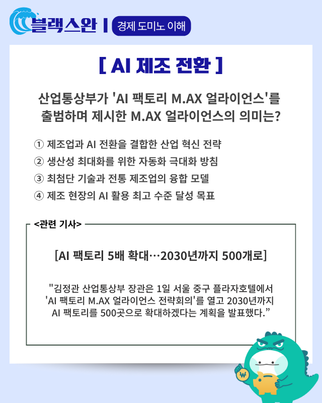 - 핵심 요약: 정부가 현재 약 100곳인 인공지능(AI) 팩토리를 2030년까지 500곳으로 늘리겠다는 구상을 내놓았다. 이는 국내 주요 산업 현장 대부분에서 피지컬 AI를 활용할 수 있도록 지원하겠다는 것인데 이 과정에서 삼성전자·현대차·LG전자·포스코 등 업종별 국내 대표 기업들이 대거 참여하기로 한 것으로 알려졌다. 또한 산업부는 2027년까지 100곳 이상 현장에 휴머노이드 실증사업을 진행하고 여기서 확보한 데이터를 활용해 2028년부터는 산업용 휴머노이드 양산 체제에 돌입하고 단순히 산업 현장에 피지컬 AI를 투입하는 방식을 넘어 기술 개발, 공장 설계, 시제품 생산, 물류 관리까지 모두 AI가 관리하는 완전 자율형 AI 공장도 개발하겠다는 방침이다.