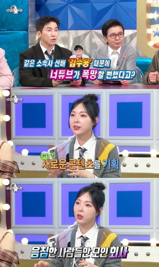 소속사 선배인 김수용 때문에 채널이 망할 뻔했다는 말에 황정혜는 "망할 뻔했다는 말 때문에 너무 죄송스러운데, 새로운 콘텐츠를 한 번 하고 싶었다. 도전을 해보자 해서 회사를 배경으로 하는 콘텐츠를 기획했다"고 입을 열었다.