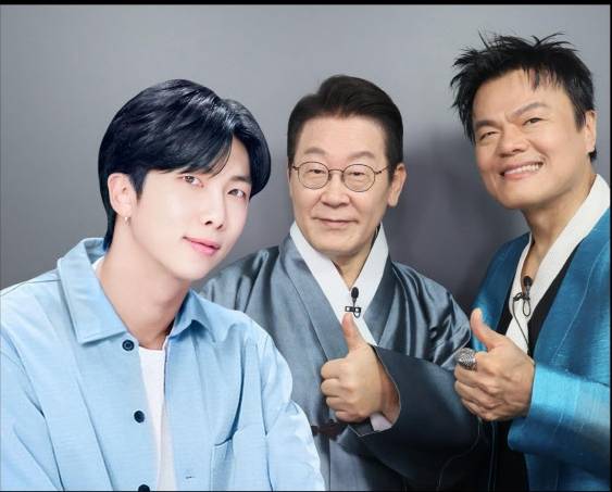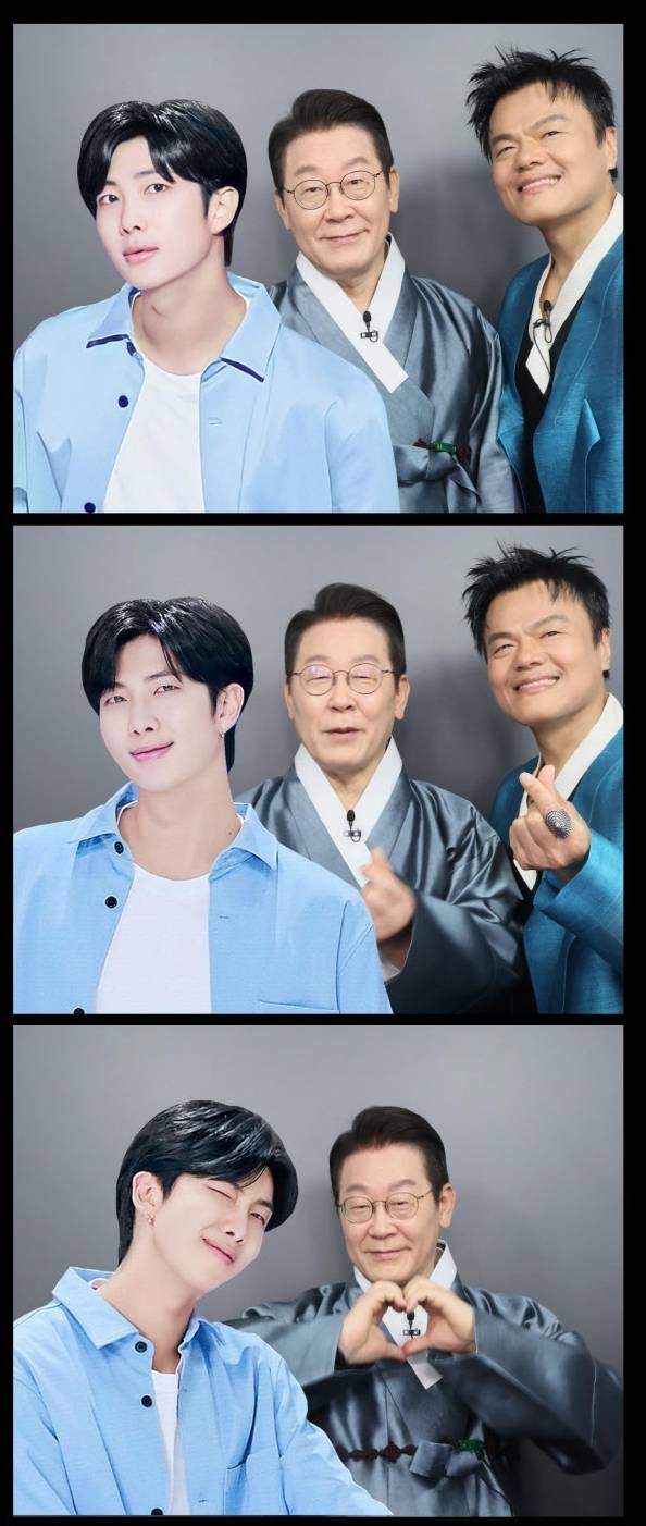 이재명 대통령이 JYP엔터테인먼트 CCO 겸 프로듀서 박진영과 함께 찍은 그룹 방탄소년단(BTS) RM 프레임의 '네 컷 사진'이 화제다.