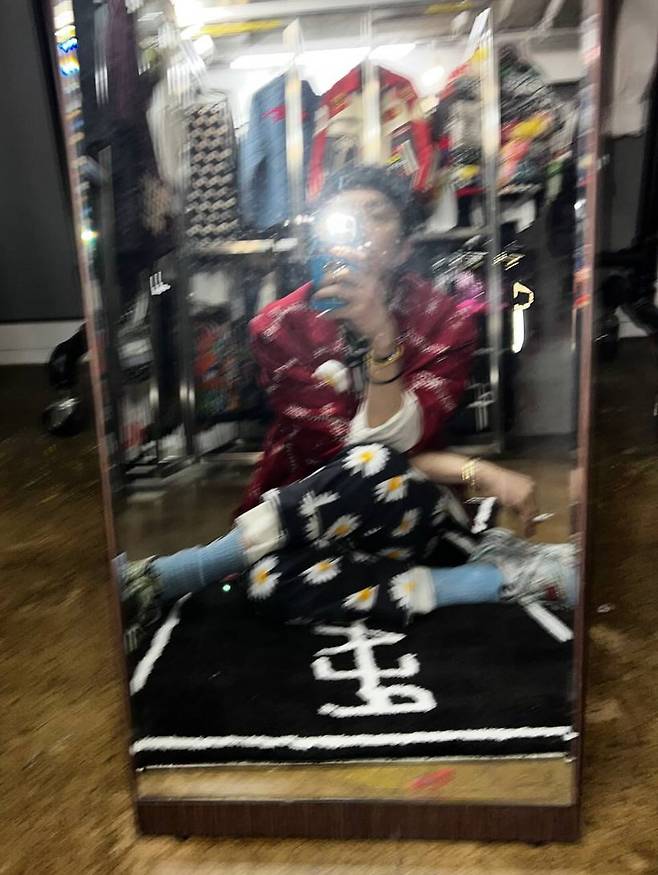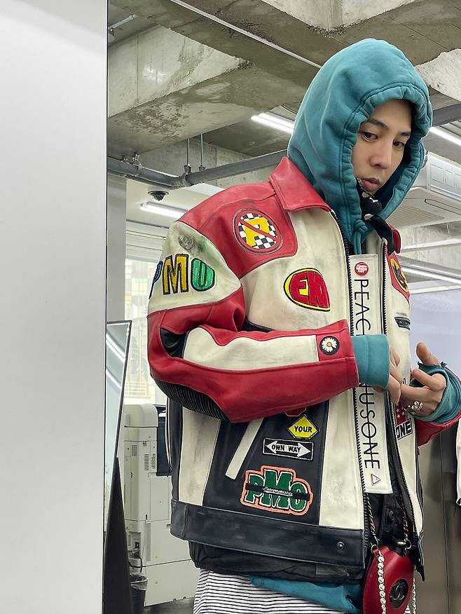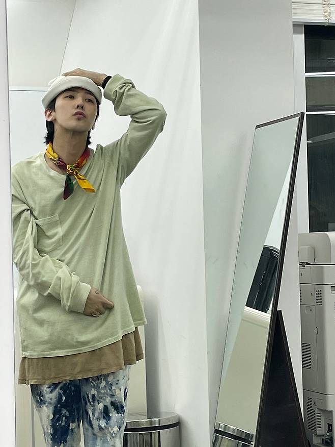 사진 속에는 거울을 보며 자신의 스타일링을 체크 중인 지드래곤의 모습이 담겨있다.