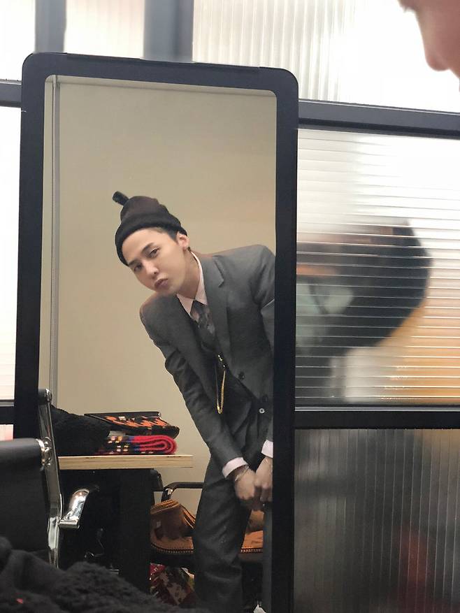 사진 속에는 거울을 보며 자신의 스타일링을 체크 중인 지드래곤의 모습이 담겨있다. 수트에 모자를 매치한 스타일도 완벽하게 소화하며 이에 어울리는 포즈와 표정을 선보이고 있는 모습이 시선을 단번에 끈다.
