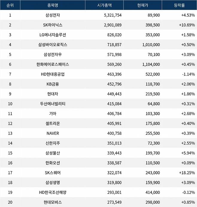 한편 시가총액 20위권 종목들은 기아(000270) ▲2.68%, 셀트리온(068270) ▲0.40%, NAVER(035420) ▲0.39%, 신한지주(055550) ▲2.55%, 삼성물산(028260) ▲5.94%, 한화오션(042660) ▲0.09%, SK스퀘어(402340) ▲18.25%, 삼성생명(032830) ▲3.09%, HD한국조선해양(009540) ▼0.12%, 현대모비스(012330) ▲0.85% 등의 성적을 기록하고 있다.