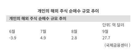2일 금융투자업계 및 국제금융센터에 따르면 지난달 총 27억7000만달러(3조8879억원) 규모의 해외 주식을 순매수했다. 지난 8월(2억8000만달러)의 10배에 달하는 규모다.