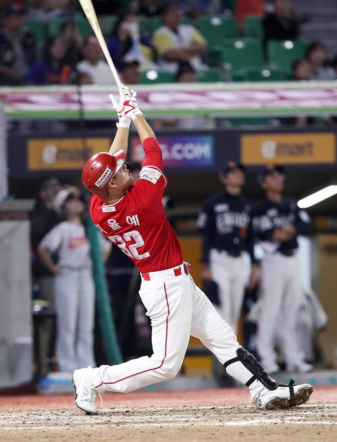 이율예의 데뷔 첫 안타가 나온 건 지난달 20일 문학 두산전이었다. 이율예는 팀이 12-2로 크게 리드하던 8회말 2사 1, 2루에서 김유성을 상대로 왼쪽 담장을 넘기는 스리런 홈런을 터트렸다.
