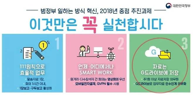 행안부에서는 2018년부터 'G드라이브 이용지침'을 운영해왔다. 이는 업무중 생산관리되는 모든 업무자료는 PC에 저장하지 말고 G드라이브에 저장해야 한다는 원칙이었다.