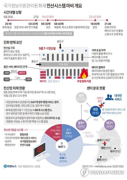 (서울=연합뉴스) 김민지 기자 = 지난 26일 국가 전산망의 심장부나 다름없는 대전의 국가정보자원관리원에서 발생한 화재로 647개 정부 행정서비스와 내부 업무망 등 전산 시스템이 모두 정지한지 일주일이 지났다.