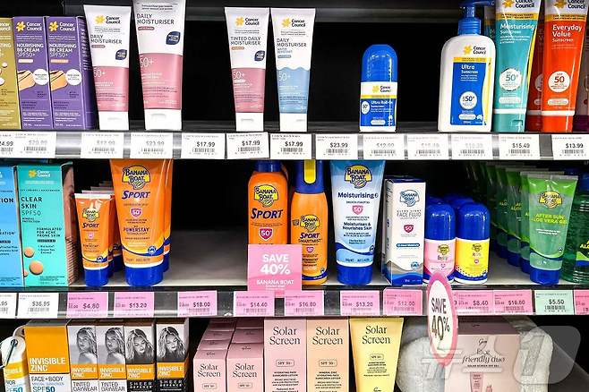 (시드니 AFP=뉴스1) 이정환 기자 = 2일(현지시간) 호주 시드니의 한 매장 선반에 자외선 차단제가 진열되어 판매되고 있다. 호주에서는 소비자 권익 단체의 분석 결과 많은 제품이 제조사가 주장하는 자외선 차단 지수(SPF)를 충족하지 못하는 것으로 밝혀지면서 12개가 넘는 자외선 차단제가 매장에서 철수했다. 2025.10.02