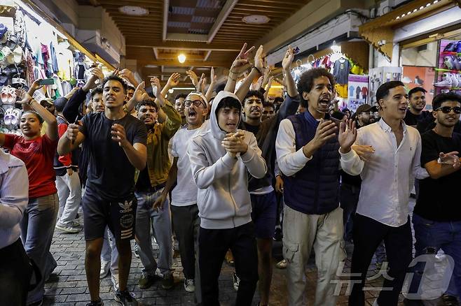 (라바트 AFP=뉴스1) = 지난 29일(현지시간) 모로코 수도 라바트의 한 시장에서 모로코 Z세대들이 주도하는 시위대가 공중 보건 및 교육 부문 개혁을 요구하는 구호를 외치고 있다. 2025.10.02