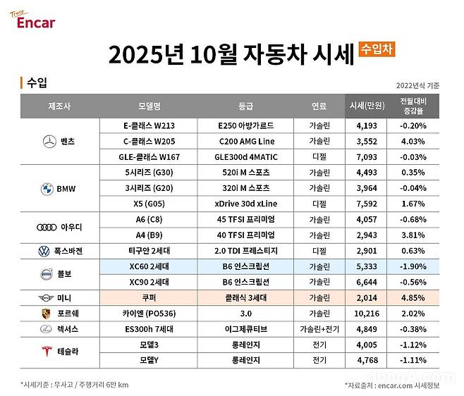엔카닷컴이 2일 2025년 9월 중고차 시세를 공개했다. 분석 대상은 주요 브랜드 2022년식, 6만km 무사고 차량이었다.