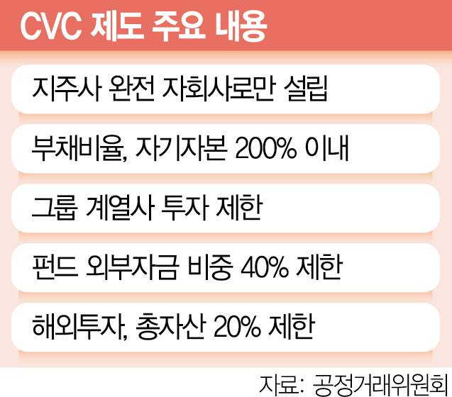 거기에다 현행법상 지주사가 CVC를 두려면 지분 100% 완전 자회사 형태여야 하고 펀드 조성 시 외부 자금 비중은 40% 이내로 제한된다. 총수 일가 지분 보유 기업이나 그룹 계열사에는 투자할 수 없으며 해외투자는 CVC 총자산의 20% 범위 내에서만 허용돼 제약이 많다. 이에 업계에서는 그동안 공정위 등에 펀드 조성 시 외부 자금 허용 한도를 최소 50% 이상 늘려달라고 요구했지만 공정위는 부정적 입장을 고수해왔다.