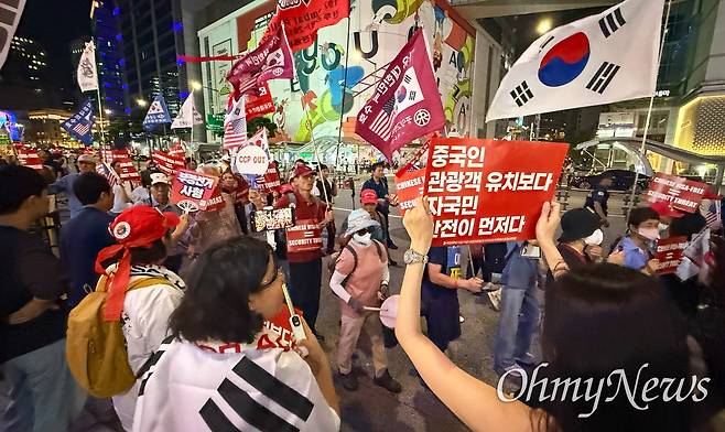 | ▲ 9월 9일 오후 ‘차이나 리(재명) 아웃’ 행진에 참여한 자유대학 등 윤석열 지지자들이 외국인 관광객들이 많은 서울 중구 명동을 행진하며, “차이나 아웃” “닥쳐!” 등 혐중 구호를 영어로 외쳤다. 이날 오전 이재명 대통령은 국무회의 토의중 외국인 관광객이 많은 명동 한복판에서 열리고 있는 혐중시위에 대해 "관광객을 늘려야 하는데 얼마 전 기사를 보니깐 특정국가 관광객을 모욕하는 집회를 하고 있더라”며, ‘표현의 자유’가 아니라 ‘깽판’이라고 지적하고 대책마련을 주문했다. |