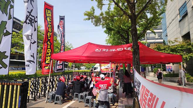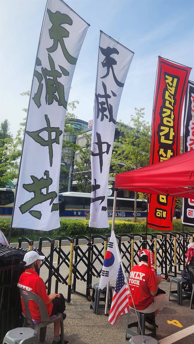 | ▲ 2일 오전 서울 중앙지방법원 앞에서 윤석열 전 대통령 지지자들이 '윤석열 보석 청구 인용' 집회를 열고 있다. 집회 현장 한켠에 '천멸중공(하늘이 중국 공산당을 멸할 것이다)'이라는 글귀가 적힌 대형 깃발이 휘날리고있다. |