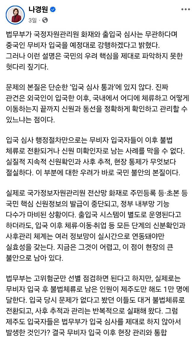 | ▲ 나경원 국민의힘 의원이 지난 9월 27일 페이스북을 통해 "법무부가 국정자원관리원 화재와 출입국 심사는 무관하다며 중국인 무비자 입국을 예정대로 강행하겠다고 밝혔다. 입국 심사 행정절차만으로 무비자 입국자들이 불법 체류로 전환되거나 신원 미확인자로 남는 사례를 막을 수 없다"고 밝혔다. 중국인 관광객의 입국을 비난하며 전산망 화재를 중국인의 책임으로 돌리는 듯한 해당 발언은 '혐중' 정서 자극으로 논란이 됐다. ⓒ 나경원 의원 페이스북 |