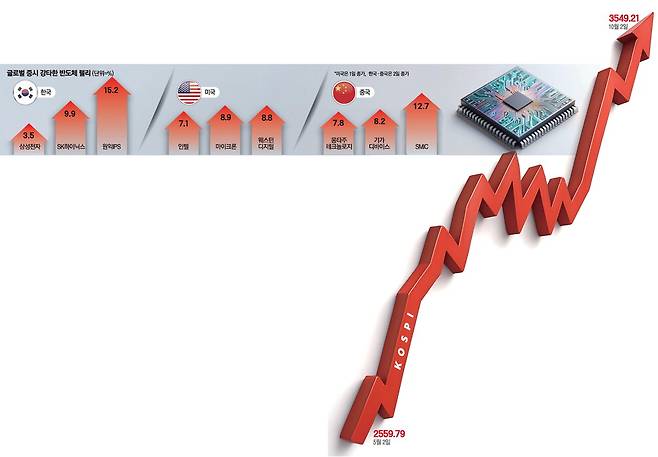 인공지능(AI) 산업이 주도하는 메모리 반도체 슈퍼 사이클이 가시화하자 삼성전자와 SK하이닉스는 물론 중국·일본·미국 반도체 기업 주가도 동반 상승했다.