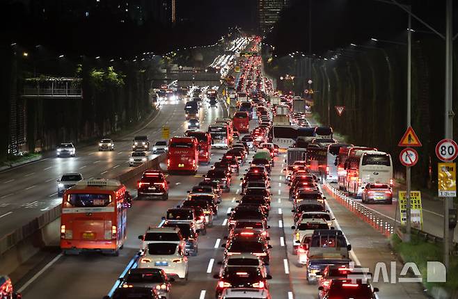 [서울=뉴시스] 배훈식 기자 = 추석 귀성 행렬이 시작된 2일 오후 경부고속도로 잠원IC 하행선에 고향으로 향하는 차량들이 꼬리에 꼬리를 물며 서행하고 있다. 2025.10.02. dahora83@newsis.com