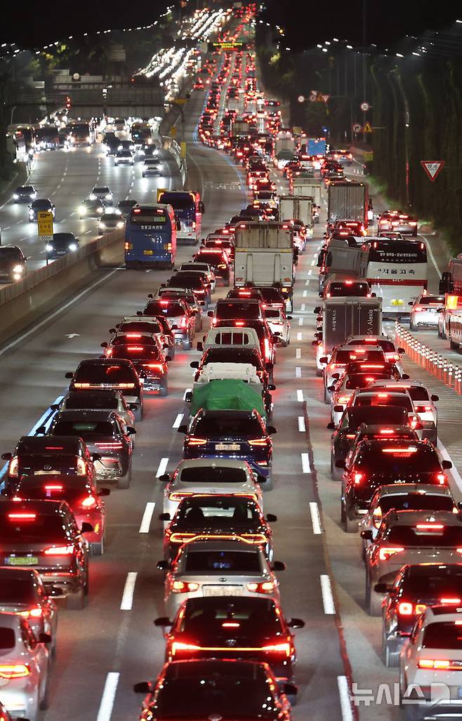 [서울=뉴시스] 배훈식 기자 = 추석 귀성 행렬이 시작된 2일 오후 경부고속도로 잠원IC 하행선에 고향으로 향하는 차량들이 꼬리에 꼬리를 물며 서행하고 있다. 2025.10.02. dahora83@newsis.com