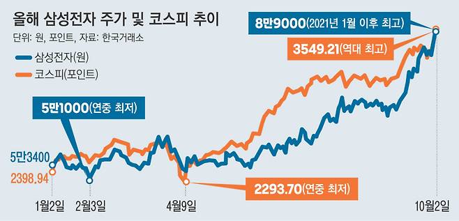 삼성전자가 4년9개월 만에 장중 9만전자에 올라서면서 코스피를 둘러싼 기대감이 커지고 있다. 상법 개정 등 이재명 정부의 증시부양 정책으로 코스피 상승이 이어지는 가운데 글로벌 인공지능(AI) 사이클에서 소외됐던 삼성전자가 AI의 수혜를 받기 시작하면서 국내 증시 상승세가 더 가팔라질 수 있다는 것이다. 그러나 인공지능(AI) 거품론이 불거지고 반도체 쏠림이 커진 만큼 반작용도 커질 수 있는 데다 반도체 온기가 경제 전반으로 퍼지기 어렵다는 점은 한계로 꼽힌다.