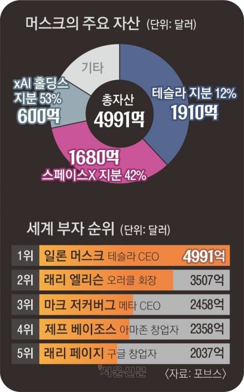 머스크의 자산은 크게 ▲2003년 설립한 전기차 업체 ‘테슬라’ ▲2002년 설립한 민간 우주탐사 기업 ‘스페이스X’ ▲올해 소셜미디어(SNS) 엑스(X)와 인공지능(AI) 스타트업 xAI가 합병해 탄생한 ‘xAI홀딩스’ 등 3개 기업의 지분으로 구성돼 있다. 이날 ‘5000억 달러’의 신기원을 연 건 나스닥에서 테슬라 주가가 4% 가까이 급등하며 그의 자산에 약 93억 달러(13조원)를 추가한 덕분이다. 다만 장 후반 주가가 약간 떨어지면서 이날 종가 기준 머스크의 총자산은 4991억 달러(699조 6800억원)로 집계됐다. 머스크는 테슬라 지분을 12%가량 소유하고 있는데, 포브스는 현재 가치가 1910억 달러(268조원)에 달한다고 분석했다. 그의 전체 재산의 40%에 육박한다.