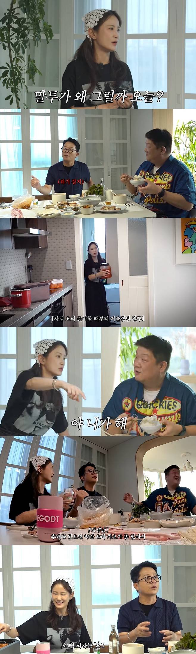 김지민은 유민상에게 "나랑 결혼하고 난 후부터 말투가 계속 이렇다. '야! 네가 해'라고 한다"라고 하소연했고 김준호는 "오빠는 후배들 앞에 있으면 가오가 생겨서 그렇다"라고 해명했다.